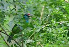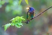 蓝喉拟啄木鸟,是须鴷科、拟啄木鸟属的鸟类。蓝喉拟啄木鸟为小型鸟类,体长20-23厘米。前额至头顶鲜红色,其上有一宽阔的黑色横带,将此红色分为前后二块;头侧、颏、喉蓝色,下喉两侧各具一红色点斑。…全部>>