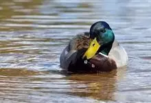 绿头鸭属游禽,大型鸭类。体长47-62厘米,体重大约1千克,外形大小和家鸭相似。雄鸟嘴黄绿色,脚橙黄色,头和颈辉绿色,颈部有一明显的白色领环。上体黑褐色,腰和尾上覆羽黑色,两对中央尾羽亦为黑色,且向…全部>>