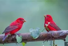 普通朱雀是雀形目雀科朱雀属鸟类,又名红朱雀、马料、青麻料。雄鸟上体红色,下体淡红色;头部、喉部、胸部及腰部亮红色;背部褐色染红色;两翼及尾黑褐色,羽缘染红色。雌鸟上体橄榄褐色,下体近白色,…全部>>