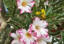 沙漠玫瑰 Roem. & Schult.),别名天宝花、阿拉伯沙漠玫瑰、索马里沙漠玫瑰等,为夹竹桃科沙漠玫瑰属的一种多肉灌木或小乔木植物。其树干肿胀,茎干光滑,白绿色或灰白色,…全部>>