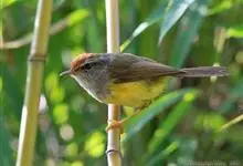普通缝叶莺,是雀形目鹅科莺亚科缝叶莺属一种。体长10-14厘米,体重7-10克,雄鸟前额棕红,头顶至枕棕橄榄褐,上体橄榄绿染黄,飞羽及尾羽暗褐;繁殖期雄鸟的中央尾羽特形延长,下体淡皮黄白色。…全部>>