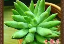 千佛手又名王玉珠帘、菊丸,是景天科的多肉植物,景天属与拟石莲花属的跨属杂交种。无明显休眠期,幼株比较矮小,多年生老株会形成垂吊状,非常适合家庭盆栽。此品种最早在美国加利福尼亚州被培育,…全部>>