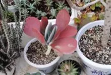 唐印为景天科伽蓝菜属的多年生肉质草本植物。植株中型,株高50厘米,宽20厘米,多分枝;叶片肉质,对生,卵形,全缘,先端钝圆,叶片淡绿色至灰绿色,表面被有厚厚的白粉,光照充足时,叶缘呈红色;圆锥花序,…全部>>