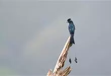 发冠卷尾是中型鸟类,体长28-35厘米。通体绒黑色缀蓝绿色金属光泽,额部具发丝状羽冠,外侧尾羽末端向上卷曲。栖息于海拔1500米以下的低山丘陵和山脚沟谷地带,多在常绿阔叶林、次生林或人工松林中活动。…全部>>
