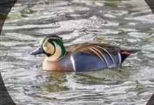 绿翅鸭是小型鸭类,体长37厘米,体重约0.5千克。嘴脚均为黑色。雄鸟头至颈部深栗色,头顶两侧从眼开始有一条宽阔的绿色带斑一直延伸至颈侧,尾下覆羽黑色,两侧各有一黄色三角形斑,在水中游泳时,极为醒目。…全部>>