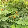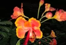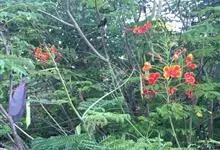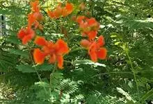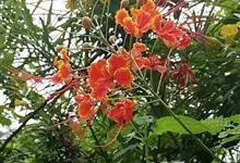 洋金凤 Sw.),豆科小凤花属灌木状或小乔木植物,枝无毛,绿或粉绿色;二回羽状复叶;总状花序伞房状,萼片无毛,花瓣橙红或黄色,圆形,花丝红色,子房无毛,花柱橙黄色;荚果窄而薄,…全部>>