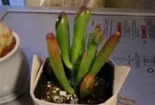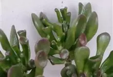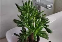 筒叶花月,是景天科青锁龙属的多年生草本植物。植株多分株,灌木状,茎较粗壮,圆柱形,表皮灰褐色;叶片肉质,互生,呈圆筒状,簇生于茎或分枝顶端,叶端呈斜截形,截面为椭圆形;花呈星状,淡白色;花期秋季。…全部>>