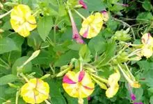 即紫茉莉,英文名:Four-o'clock,Marvel of Peru,为紫茉莉科、紫茉莉属多年生草本植物,一年生栽培。株高50~80cm。根粗壮,茎多分枝而散生。叶对生,卵形或心脏形。花数朵簇生…全部>>