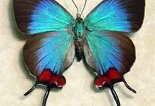 天堂凤蝶翅展可达105mm。前、后翅自基角至后缘约1/2~2/3端为纯净的宝蓝色,后角至后缘1/3~1/2端为黑色,后翅有黑色的尾突。翅背面为棕褐色。全部>>