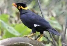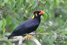金冠树八哥为椋鸟科树八哥属的鸟类。体长约23厘米,闪辉黑色。特征为具翼斑及颏黄色,脸颊裸露皮肤粉黄色。分布于印度、缅甸、泰国以及中国大陆的云南、广东等地。…全部>>