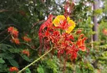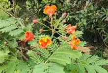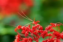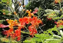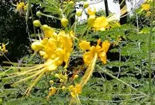 洋金凤 Sw.),豆科小凤花属灌木状或小乔木植物,枝无毛,绿或粉绿色;二回羽状复叶;总状花序伞房状,萼片无毛,花瓣橙红或黄色,圆形,花丝红色,子房无毛,花柱橙黄色;荚果窄而薄,…全部>>