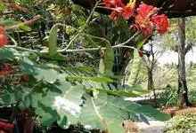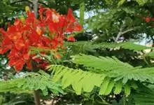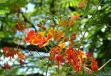 洋金凤 Sw.),豆科小凤花属灌木状或小乔木植物,枝无毛,绿或粉绿色;二回羽状复叶;总状花序伞房状,萼片无毛,花瓣橙红或黄色,圆形,花丝红色,子房无毛,花柱橙黄色;荚果窄而薄,…全部>>