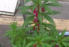 洋金凤 Sw.)是豆科、云实属植物。枝光滑,绿色或粉绿色,散生疏刺。二回羽状复叶;羽片4-8对,对生;小叶7-11对,长圆形或倒卵形,顶端凹缺;小叶柄短。总状花序近伞房状,顶生或腋生,…全部>>