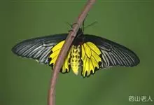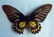 金裳凤蝶是凤蝶科、裳凤蝶属的动物。金裳凤蝶身体呈黑色,头、颈和胸侧有红毛,腹部有黑黄两色相间条纹,雄蝶前翅黑色,具黑天鹅绒光泽,各脉两侧灰白色,后翅金黄色,各室外缘有等腰三角形黑斑1枚,斑内侧有晕,…全部>>