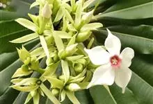 海杧果是夹竹桃科海杧果属的乔木。高4~8米;树皮为灰褐色;全株有丰富乳汁;叶厚纸质,呈倒卵状长圆形或倒卵状披针形,叶面为深绿色,叶背为浅绿色;花为白色,有芳香;核果双生或单个,呈阔卵形或球形,…全部>>