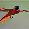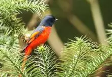 灰喉山椒鸟:共有8个亚种。体长18-22厘米。雄鸟头部和背亮黑色,腰、尾上覆羽和下体朱红色,翅黑色具一大一小的两道朱红色翼斑。中央尾羽黑色,外侧尾羽基部黑色,端部红色。…全部>>