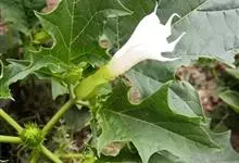 洋金花是茄科曼陀罗属植物,一年生草本植物,全株近于无毛。茎直立,圆柱形,高30~100cm,基部木质化,上部呈义状分枝。叶互生,上部的叶近于对生;叶柄长2~6cm,表面被疏短毛;叶片卵形、长卵形或心形,…全部>>