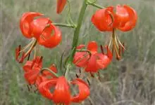 山丹是百合科百合属的多年生草本植物。鳞茎卵形或圆锥形,鳞片长圆形或长卵形,白色;叶散生茎中部,线形,边缘有乳头状突起;花单生或数朵成总状花序,花鲜红色,常无斑点,花被片反卷,…全部>>