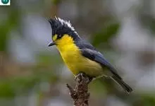 台湾黄山雀体长约13厘米。头顶至后颈黑色,有一长的黑色羽冠,羽冠末端和后颈中央白色。背苍绿色,两翅和尾黑色,羽缘蓝灰色,外侧尾羽白色。额基和下体鲜黄色,尾下覆羽白色,雄鸟腹部有一黑斑。…全部>>