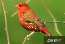 红梅花雀小型鸟类,体长9-10厘米。雄鸟通体朱红色,背、肩、胸等满布白色小斑点,两翅和尾黑褐色均具白色端斑,嘴红色,脚蜡黄色。雌鸟上体淡褐色或赭褐色,翅上中覆羽、大覆羽和内侧飞羽末端具白色斑点,…全部>>