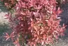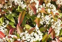 红叶石楠 是蔷薇科,石楠属杂交种,为常绿小乔木或灌木,乔木高可达5米、灌木高可达2米。叶片革质,长圆形至倒卵状、披针形,叶端渐尖,叶基楔形,叶缘有带腺的锯齿,花多而密,复伞房花序,花白色,梨果黄红色,…全部>>