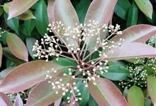 石楠 Kalkman),是蔷薇科石楠属的常绿乔木,高5~12米,株型紧凑,树冠圆球形。树枝为褐灰色;鳞片为褐色,没有毛;叶片革质,长椭圆至侧卵状椭圆形,有锯齿,新叶红色光亮。复伞房花序,白色小花,…全部>>