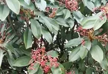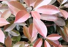 红叶石楠 是蔷薇科,石楠属杂交种,为常绿小乔木或灌木,乔木高可达5米、灌木高可达2米。叶片革质,长圆形至倒卵状、披针形,叶端渐尖,叶基楔形,叶缘有带腺的锯齿,花多而密,复伞房花序,花白色,梨果黄红色,…全部>>