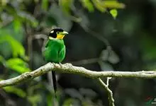 长尾阔嘴鸟是雀形目阔嘴鸟科的鸟类,体长约25厘米,是绿色阔嘴鸟。形长的楔形尾蓝色,喉及脸黄色,顶冠及颈背黑色。两翼黑并具显著的蓝色斑块。头顶具蓝色小点斑,眼后有一黄色点斑。亚成鸟多为绿色。结群活动于…全部>>