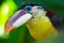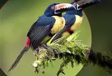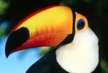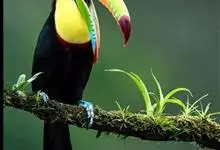 鵎鵼:又名巨嘴鸟。体长约67厘米,嘴巨大,长17~24厘米,宽5~9厘米,形似嘴刀。嘴非常漂亮,上半部黄色,略呈淡绿色,下半部呈蔚蓝色,喙尖点缀着一点殷红。眼睛四周镶嵌着天蓝色羽毛眼圈,胸脯橙黄色,…全部>>