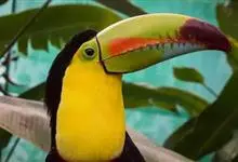鵎鵼:又名巨嘴鸟。体长约67厘米,嘴巨大,长17~24厘米,宽5~9厘米,形似嘴刀。嘴非常漂亮,上半部黄色,略呈淡绿色,下半部呈蔚蓝色,喙尖点缀着一点殷红。眼睛四周镶嵌着天蓝色羽毛眼圈,胸脯橙黄色,…全部>>