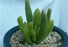 筒叶花月,是景天科青锁龙属的多年生草本植物。植株多分株,灌木状,茎较粗壮,圆柱形,表皮灰褐色;叶片肉质,互生,呈圆筒状,簇生于茎或分枝顶端,叶端呈斜截形,截面为椭圆形;花呈星状,淡白色;花期秋季。…全部>>