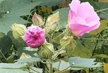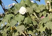 木芙蓉,锦葵科木槿属落叶灌木或小乔木。小枝上有细绒毛;叶片为卵状心形,托叶为披针形,常早落;花单生,花萼为钟形,花冠初为白色或淡红色,后逐渐变为深红色;果实为扁球形,有淡黄色的毛附着。花期8到10月。…全部>>
