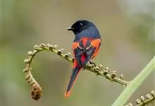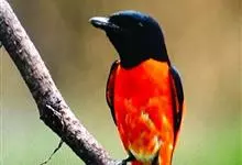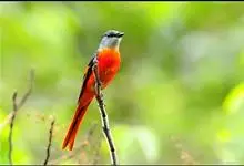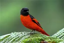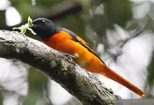 灰喉山椒鸟:共有8个亚种。体长18-22厘米。雄鸟头部和背亮黑色,腰、尾上覆羽和下体朱红色,翅黑色具一大一小的两道朱红色翼斑。中央尾羽黑色,外侧尾羽基部黑色,端部红色。…全部>>