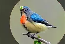 红胸啄花鸟:体重5-10克,体长60-92毫米。体形纤小。雄鸟上体呈辉亮的金属绿色;下体棕黄,胸部具一朱红色块斑,极易与其他啄花鸟区别。雌鸟上体呈橄榄绿,下体棕黄色。虹膜褐色,嘴褐黑色或角灰色,…全部>>