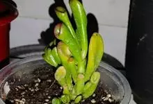 筒叶花月,是景天科青锁龙属的多年生草本植物。植株多分株,灌木状,茎较粗壮,圆柱形,表皮灰褐色;叶片肉质,互生,呈圆筒状,簇生于茎或分枝顶端,叶端呈斜截形,截面为椭圆形;花呈星状,淡白色;花期秋季。…全部>>