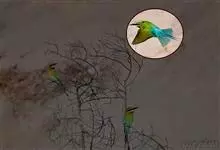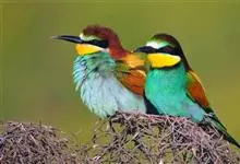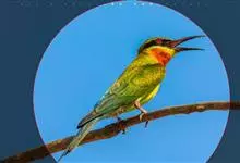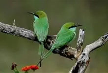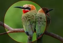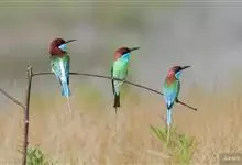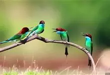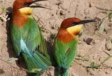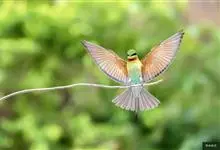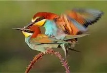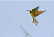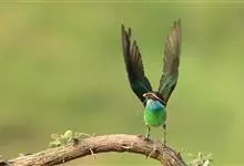 栗喉蜂虎是蜂虎科蜂虎属的鸟类。有热带鸟类羽毛艳丽的特征:喉部是栗红色的,黑色的过眼纹,翅膀和背部是绿色的,尾翼是蓝色的,飞行时翅膀下面的羽毛是橙黄色的,在阳光的照射下,它们全身闪烁着金属般的艳丽光泽,…全部>>