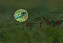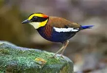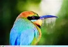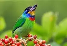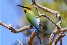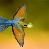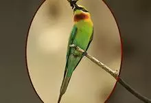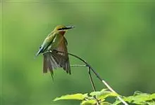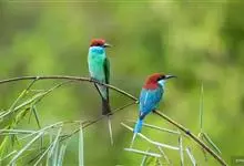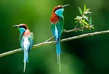 蓝喉蜂是蜂虎科蜂虎属鸟类。体长26-28厘米,嘴长而弯曲,有明显细长的中央尾羽。头部、颈部和背部为巧克力色,有黑色眼纹。喉部、腰部和尾羽为蓝色。腹部和两翼为绿色。幼鸟外观似成鸟,头部、颈部和背部为绿色,…全部>>