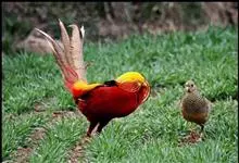 雉鸡:鸟纲、雉科、雉属的一种走禽,共有30个亚种。体形较家鸡略小,但尾巴却长得多。雄鸟和雌鸟羽色不同,雄鸟羽色华丽,多具金属反光,头顶两侧各具有一束能耸立起而羽端呈方形的耳羽簇,…全部>>