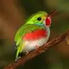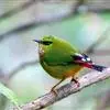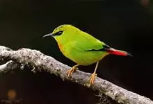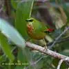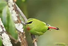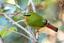 火尾绿鹛是莺科、绿鹛属小型鸟类,体长11-14厘米。上体绿色,头顶至枕具黑色鳞状斑,眼先和眼后黑色,眉纹黄绿色。两翅黑色具黄色和红色翅斑及白色端斑,极为醒目。中央一对尾羽绿色,外侧尾羽鲜红色。…全部>>