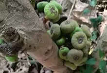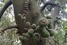 大果榕是桑科榕属的小乔木,株高可达10米;幼枝被柔毛;叶互生,宽卵状心形或近圆形;雄花无梗、匙形、花丝长,雌花生于雌株榕果内,子房白色;榕果簇生于树干基部或老茎短枝上、扁球形或陀螺形,…全部>>