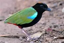 绿胸八色鸫:是雀形目八色鸫科的鸟类,共有12个亚种。体长为16-18厘米,体重65-69克。体型圆胖,尾短,腿长。头黑,上体绿色,两翼深色而具白色斑纹,头顶至后枕深褐,胸及腹部苹果绿,臀亮红。…全部>>