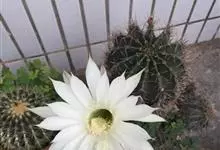 仙人球花 仙人掌科,仙人球属。植株单生或成丛。幼株球形,老株长成圆筒状,高可达75厘米,直径12-15厘米。球体暗绿色,具棱11-12。刺锥状,黑色,长1-1.5厘米。花着生于球体侧方,大型嗽喇叭状…全部>>