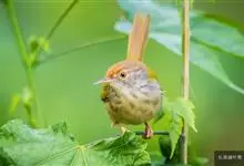 普通缝叶莺,是雀形目鹅科莺亚科缝叶莺属一种。体长10-14厘米,体重7-10克,雄鸟前额棕红,头顶至枕棕橄榄褐,上体橄榄绿染黄,飞羽及尾羽暗褐;繁殖期雄鸟的中央尾羽特形延长,下体淡皮黄白色。…全部>>
