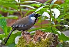 黑喉噪鹛是噪鹛属鸟类。体长24-29厘米,体重75-90克。雄鸟前额、眼先、眼周和眼后纹以及颊、须和喉黑色;黑色前额和蓝灰色头顶之间有道白色细斑;颈侧具椭圆形白斑,…全部>>