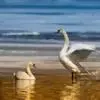 小天鹅为大型水禽,体长110~130厘米,体重4~7千克,雌鸟略小。它与大天鹅在体形上非常相似,同样是长长的脖颈,纯白的羽毛,黑色的脚和蹼,身体也只是稍稍小一些,颈部和嘴比大天鹅略短,但很难分辩。最…全部>>