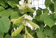 扁豆 Sweet)是豆科扁豆属多年生缠绕藤本植物,又名鹊豆、沿篱豆、藤豆等。全株几无毛,茎长可达6米。羽状复叶具3小叶;托叶基着,叶片披针形;小托叶线形,小叶宽三角状卵形,宽与长相等,…全部>>