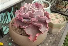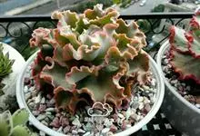 女王花笠,又名扇贝石莲花、女王花舞笠,是景天科拟石莲花属的多肉植物。由美国加利福尼亚州的育种师Dick Wright于1964年培育。特征是呈大波浪状褶皱的红色叶缘和气质高贵的粉紫色调。…全部>>