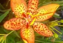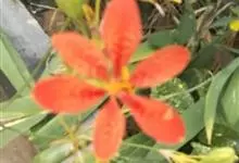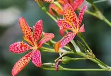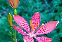射干 Redouté)是鸢尾科射干属多年生草本植物。根状茎为不规则的块状,斜黄色或黄褐色;花橙红色,散生紫褐色的斑点;花药呈条形;子房下位,倒卵形;蒴果倒卵形或长椭圆形;种子圆球形,黑紫色,有光泽。…全部>>