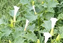 洋金花是茄科曼陀罗属植物,一年生草本植物,全株近于无毛。茎直立,圆柱形,高30~100cm,基部木质化,上部呈义状分枝。叶互生,上部的叶近于对生;叶柄长2~6cm,表面被疏短毛;叶片卵形、长卵形或心形,…全部>>