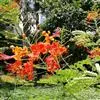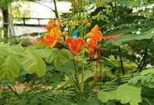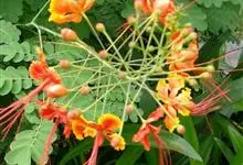 洋金凤 Sw.),豆科小凤花属灌木状或小乔木植物,枝无毛,绿或粉绿色;二回羽状复叶;总状花序伞房状,萼片无毛,花瓣橙红或黄色,圆形,花丝红色,子房无毛,花柱橙黄色;荚果窄而薄,…全部>>